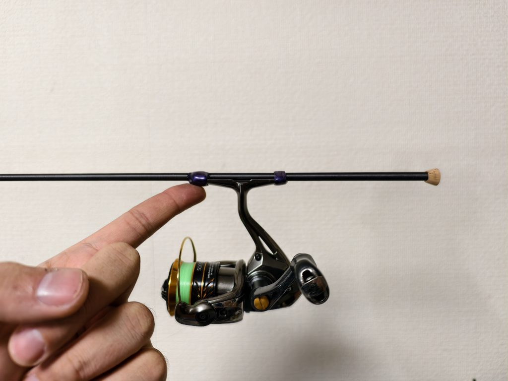 さすがにバランスは悪いのでは?と思われるかもしれませんが、ここまで軽いとロッドバランスはほぼ関係なく、単純にリール本体のバランスでほぼ決まってしまいます。上の画像の通り、軽量リールを組み合わせても理想的な位置にバランスされます。